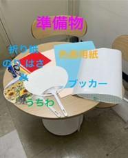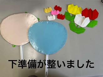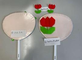 ③うちわにブッカーを貼る(セロテープを付けたり貼ったりできます)出来上がったチューリップの裏にわっかにしたセロテープをつけておきます。歌の歌詞のタイミングで貼り付けていきます。