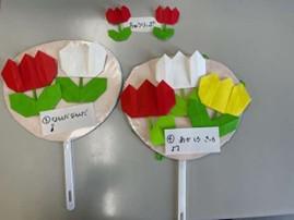 子どもは、新学期をまだまだ理解できなかったり、わかってはいるけどなんだか落ち着かなかったり、そんな何とも言えない気持ちをその子なりの表現で伝えます。泣く子、あちこち歩き回る子、行きたくないって朝からぐずる子、発熱や、腹痛と体調に変化をみせたり本当に様々です。いつも通り平気そうな子の中にも実は不安を抱えてしまう事もあります。子どもたち一人ひとりみんな違います。泣くことひとつとっても、大きな声で表現する子もいれば、シクシク泣く子も。みんなが慣れてきたころに、泣いてしまうなんて事も、毎年のよくある光景です。この時期保育所では、こどもが自分のペースで慣れてくることを大切に、一人ひとりの様子を見ながら、ゆったりとした時間が過ごせるように取り組んでいます。当然、その子その子で興味のあるものが違うので、いろいろな遊びやワクワクする気持ちを大事にしながら、その子の好きをみつけだし、好きな遊びや友達と過ごせたらいいなぁと思います。個人差もありますので、他のこどもさんと比べたりせず、子どもの不安に寄り添ってあげてほしいと思います。また同時に毎日の生活リズムを作って行く事は大切なことです。忙しい保護者の方もたくさんいらっしゃる事と思いますが、子どもを真ん中に一緒に考えたいですね。4月は身近でもきれいなお花が咲きますね。そこでチューリップの歌で一緒に遊べるように、「うちわペープサート」を作ってみました。