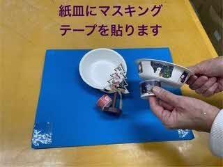まずは紙皿の外側にマスキングテープを切って貼ります。小さな子どもさんには、大人が切ったテープを貼ってもらってもいいですし、自分で切れる子どもには、思い思いに切って貼ってもいいですね。